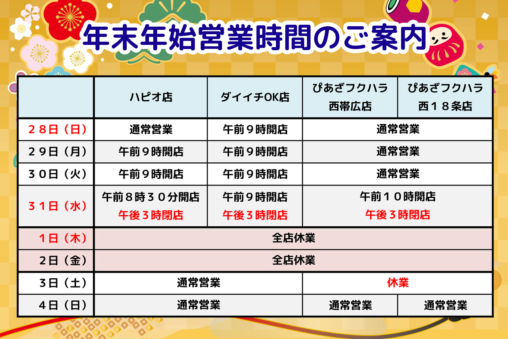 2025年12月28日から2026年1月4日まで マスヤマ各店の営業時間は以下の通りです。